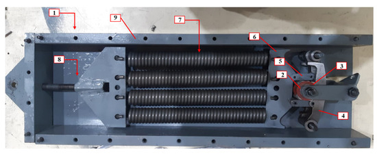 A modular prototype of the proposed device was designed and built in steel (Figure 11). The prototype was used to verify the fidelity of the mathematical model on the characterization of the device’s response, and to calibrate its parameters. The device has the basic configuration of the technology (Figure 1a,b and Figure 11), and its dimensions are constant (Table 4). It has the capability of exchanging the ring systems to modify the coefficient of friction; it also has a mechanism to apply a pre-deformation to the set of springs. According to Figure 11, the prototype (1) is composed of a load transmission shaft (2), a system of rings for each clamp (3), two clamps opposite each other (4), a pair of connecting rods (5), a spring–rod interconnection system (6), a set of springs (7), a mechanism to pre-deform the spring system (8), and a rectangular casing (9).