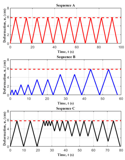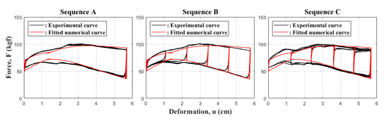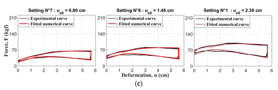 Figure 9 shows the effect of the variables and on the response of the device in a complete load–unload cycle. The variable has a more significant influence than the variable on the energy dissipation capacity of the device, which is evidenced by a greater increase in the area enclosed by the curve in the closed loop. Since the response of the device is not very sensitive to the value of the variable , the calibration of its value with experimental results is much less reliable than the calibration of the variable . The calibration could generate an overestimation of the value of the variable that would not reflect the real working condition of the device. Therefore, from now on, it is considered a fixed value = 0 and the value of the variable will only be calibrated with the experimental results of the device.