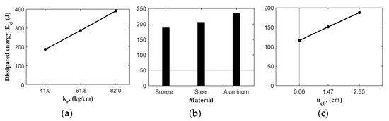 The influence of variables related to energy dissipation on the mechanical response of the device was studied. These variables are the coefficients of friction between ring–clamp and ring–shaft, , and the friction coefficient at the pivot of the clamps, . In the analysis, the value of one of these variables was fixed, and the second was modified, keeping the other design variables constant to isolate the effect of each of the variables mentioned above on the response of the device. For the friction coefficient between the ring–clamp and the ring–shaft, the values = 0.0, 0.3, and 0.6 were considered, 0.66 being the limit value that allows self-centering for this variable (Table 2). For the coefficient of friction in the pivot of the set of clamps, the values = 0.0, 0.5, and 1.0 were considered. The other design variables were kept constant considering the following values: = 5 cm, = 70 kgf/cm, and =2 cm.
