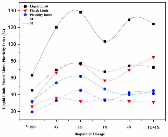 Variation of Atterberg’s limits for soil S1 and S2 at different biopolymer dosages.