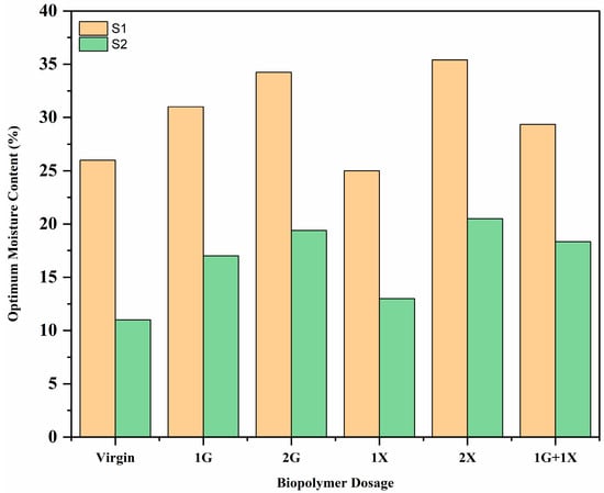 Figure 2 shows the variation of OMC for S1 and S2 at different biopolymer dosages. At 1G dosage, OMC increased by 19% and 36% for S1 and S2, respectively. It can be attributed to the hydrophilic nature of biopolymer, which increases the absorption of water and leads to an increment of OMC. The addition of G to the soil results in the rise of OMC, and the same phenomenon was reported by the researchers [,]. X-treated samples also showed an increase in OMC but not as much as compared to that of G-treated. The difference in the phenomena observed is attributed to the complex behavior of X with soil particles, and it is supported by the results of Atterberg’s limits. At 2% dosage, both X and G biopolymers showed a proportionate increment in OMC, which can be observed in Figure 2. Contrary to this, results of S1 and S2 at 1G + 1X biopolymer dosage showed a reduction in the OMC by 18% and 14%, respectively, compared to the 2G and 2X dosages of biopolymers. It is attributed to the behavior of hydrogel formed after cross-linking the X and G.