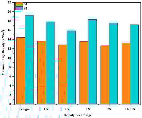 Variation of Maximum Dry Density (MDD) for soil S1 and S2 at different biopolymer dosages.