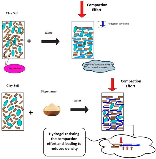 The mechanism underlying the interaction of clay particles with water and biopolymers is depicted in Figure 4. Following the addition of water to clay, the water interacts with the clay particles and forms a thin layer around them. Clay particles reorganize from a flocculated to a dispersed structure when the compaction was performed wet of optimum. Therefore, the volume decreases, and the density increases. In contrast, when biopolymers are introduced, biopolymers react with water to form a three-dimensional network known as a hydrogel. This hydrogel gets wrapped around soil particles and partially replaces the soil matrix. When a compaction effort is applied to biopolymer-amended soil, the hydrogel resists it by sharing and diffusing the force among the soil particles. Therefore, the maximum dry density of biopolymer-amended soils will be lower than that of virgin soil or soil stabilized with stabilizing agents such as cement, fly ash, etc.