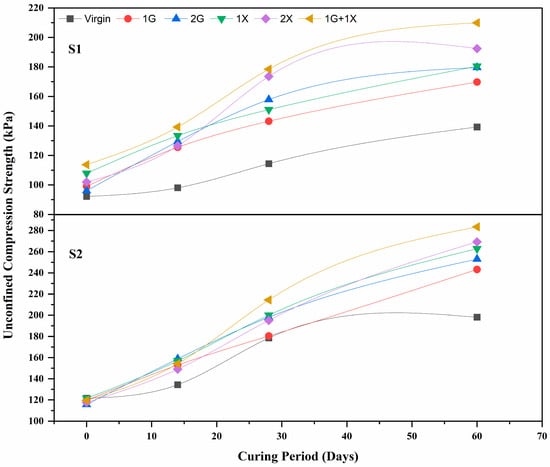 Both S1 and S2 were tested for their UCS on the day of sample preparation, and the values were 92.18 kPa and 121.6 kPa, respectively. Samples made from virgin, G, and X-treated S1 and S2 were cured and tested at the age of 14, 28, and 60 days. Results reveal that the enhancement in UCS of virgin soils S1 and S2 is very minimal. Figure 5 depicts that the UCS of 1G and 1X treated soil samples increased by around 30% for both S1 and S2 at a curing period of 14 days. A substantial enhancement in the UCS of S1 and S2 at the age of 28 days curing period was noticed. It is attributed to the conversion of hydrogel from a rubbery state to a glassy state on drying, and the same phenomenon was observed by the authors who carried out the research on soil stabilization using G and X biopolymers []. G and X cross-linked samples of S1 and S2 have shown a considerable increase in UCS at all the curing periods compared to all other individual biopolymer dosages. At the end of the 60-day curing period, the UCS of S1 and S2 treated with crosslinked biopolymers were 209.88 kPa and 283.41 kPa, respectively. It is attributed to the dense agglomeration of soil particles after the biopolymer cross-linking, which is supported by the SEM images from Figure 6 and Figure 7. Results showed that enhancement in UCS for the 2X dosage is close to that of the 1G + 1X dosage. Increasing the X biopolymer dosage may result in better enhancement of UCS by following a suitable curing method. However, the high ECF of X hinders the sustainability aspect of an infrastructure project. Cross-linking of biopolymers addresses the problems associated with the use of individual biopolymers in soil and can be encouraged to increase strength and promote sustainability.