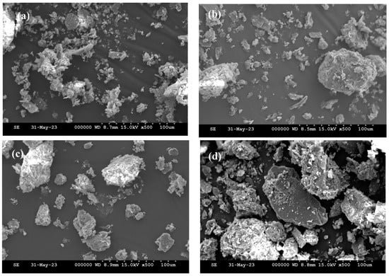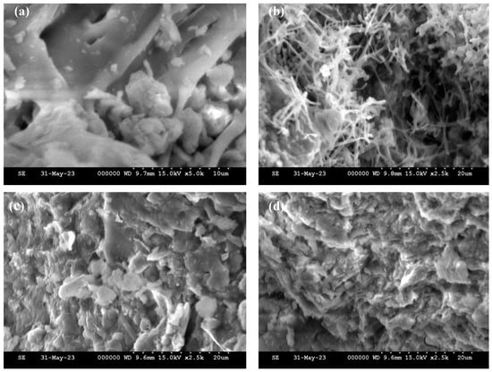 Figure 6 depicts the morphology of the microstructural arrangement of soil particles 28 days after the addition of biopolymer. Figure 6a indicates that the structure of the virgin soil is fragmented and contains some apertures. Images of soil treated at 2G dosage indicate that there are fibers connecting soil particles, as well as some void spaces. It is evident from the image in Figure 6c that the microstructural arrangement became more compact, which may have contributed to the increase in compressive strength. SEM image from Figure 6d reveals that both G and X had a coupled effect on soil S1. There are visible fibers connecting particulates, and the arrangement became denser compared to virgin soil. SEM images confirm the accumulation of hydrogel on the soil surface, and it enhances the soil and biopolymer aggregation. Due to electrically charged clay grains in the soil fabric, direct interactions (electrostatic or hydrogen bonding) between xanthan gum monomers and clay grains take place. These X monomers improve the contact area between grains by forming interconnected cation bridges, thickening the gel that covers the surfaces of the grains, and covering their surfaces [].