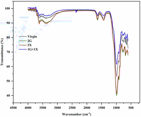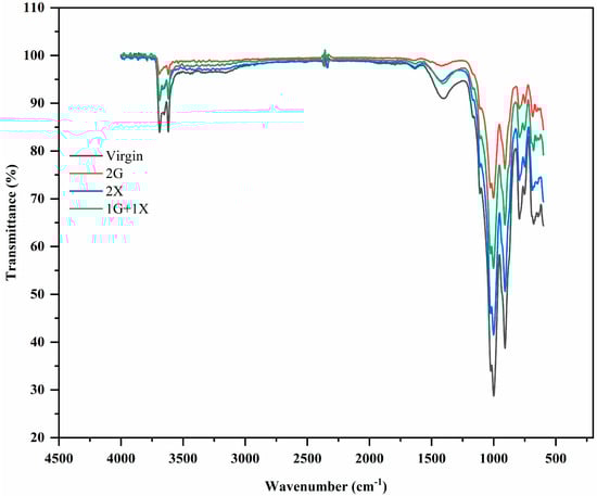 The FTIR analysis of virgin soil S2, 2G, 2X, and 1G + 1X biopolymer dosages can be seen in Figure 9. The frequency ranges are measured as wave numbers ranging from 4000 to 500 cm−1. The peak at 3689.16 cm−1 in virgin soil corresponds to O-H stretching due to water. The intensity of this peak is reduced in both X and G treated samples and increased in the 1G + 1X treated sample. The peak of 2369.12 cm−1 in virgin soil denotes O=C=O stretching, and the intensity of the peak is altered in all the biopolymer dosages. The peak at 1632.45 cm−1 in virgin soil corresponds to C=C stretching, and it disappears in 2G and 1G + 1X samples. A peak at 1400.07 cm−1 denotes O-H bending, and the intensity was reduced in 2G treated samples. The peak intensity of O-H bending was broad and strong in 2X and 1G + 1X treated samples. A peak of 1110.8 cm−1 corresponds to C-F stretching, and it disappears in 2G and 1G + 1X samples. Table 5 shows the variation of FTIR frequencies for the soil S2 at different biopolymer dosages.