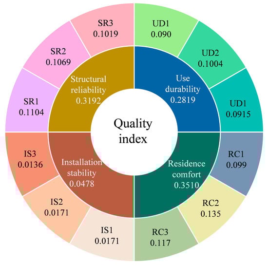 - Since prefabricated component combinations are the primary research object for this paper’s quality evaluation, the quality optimization contribution of the prefabricated building is calculated as the sum of the quality optimization contributions of the selected components, while the foundation, door, and window components that were not chosen are not taken into account.