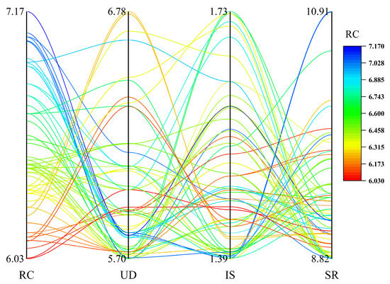 - Let be the contribution value of each secondary indicator to its first-level indicator, hereinafter referred to as weight 2, and let be the path coefficient between the secondary indicator and the first-level indicator, then the formula for calculating weight 2 is shown in Formula (4).