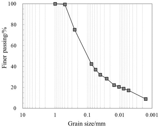 The soil utilized in this investigation was a natural silty clay sampled from Xilinhot, Nei Mongol Province, China. The grain size distribution curve of the tested soil is illustrated in Figure 1. According to the Unified Soil Classification System (USCS), the composition of the tested soil consisted of 57.5% quartz sand, 33.4% silt, and 9.1% clay. The tested soil has a specific gravity Gs of 2.69, a plastic limit of 13.11%, a liquid limit of 26.01%, and a plasticity index of 12.90. Ethylene glycol aqueous solution was employed as the confining and refrigerant fluid. The water used in this study was self-made distilled water with an electrical conductivity of 1.8 μs/cm.