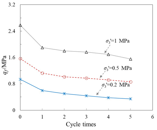 Figure 5 shows the changes in shear strength with freeze–thaw cycles for the specimens under different values. Based on the Standard for Geotechnical Testing Method (GB/T 50123-2019), the () is defined as the deviatoric stress at an of 15%. It can be seen that the decreases dramatically at first (FT from 0 to 1), and then slightly (FT from 1 to 5) as the number of FT cycle increases within the range of the tested cycles. Similar results had been observed by Wang [15].