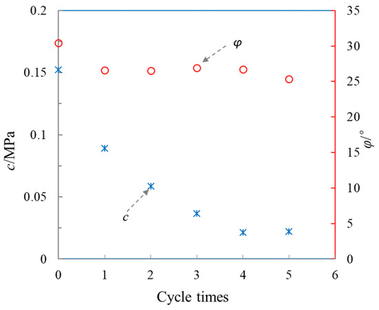 To deeply reveal the effect of FT action on the of specimens from a microscopic viewpoint, the cohesion () and internal friction angle () were determined based on the above experimental data. The detailed calculations can be found in Yang [22] and Zhou [24]. The relationships among the , , and the number of FT cycles are depicted in Figure 6. It is evident that both and consistently decreased as the number of FT cycles increased within the tested range. In general, the cohesion is mainly reflected by the joint action of various physicochemical forces (Coulomb force and bonding action, etc.), and is controlled by the space between soil particles. On the other hand, the internal friction angle is mainly reflected by the sliding and interlocking of solid particles against one another [15]. These results indicate that the pore space between soil particles may increase as the number of FT cycles increases. In other words, new micro-pores and/or cracks appear and expand in the soils.