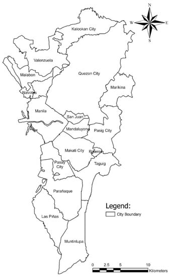 This research was conducted in Metro Manila, the National Capital Region (NCR), which encompasses 619.57 square kilometers, as shown in Figure 1. Metro Manila consists of sixteen cities, which are further subdivided into 1690 barangays, and one municipality.