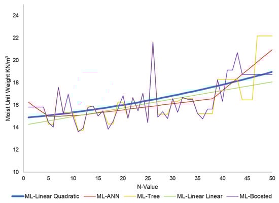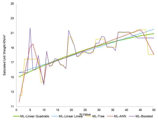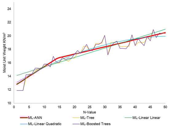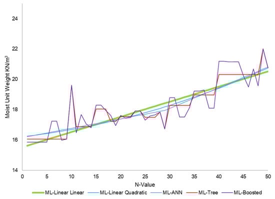 Certain limitations apply to the models used to calculate the unit weight of soil layers. Specifically, these models only apply to SPT N-values ranging from 1 to 50. If the SPT N-value exceeds 50, this indicates refusal, which suggests the presence of rocks and the inapplicability of the models. Regarding Figure 2, Figure 3, Figure 4 and Figure 5, generally, ML models, such as tree, boosted, and neural network models, usually have strong relationship indications. However, these models were highly susceptible to overfitting because they followed the detail and noise in the training data to such an extent that it negatively impacted model performance. These overfitting models could not make accurate predictions on new data because they could not generalize from the training set to the test set.
