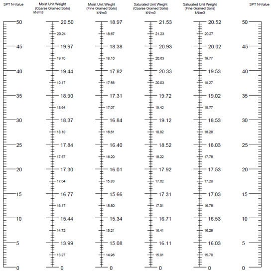 The unit weight of soil is an essential factor in determining its bearing capacity. This weight is affected by several variables, including moisture content, particle composition, and degree of compaction []. Commonly, the soil is categorized as coarse-grained or fine-grained [,] (a sample is shown in Table 1), as well as moist unit weight and saturated unit weight [,]. Unit weight, expressed in kilonewtons per cubic meter (kN/m3), calculates total and effective stresses. However, unit weight information is typically not included in exhaustive geotechnical investigation data. Consequently, correlations are commonly employed to estimate the unit weight of the soil in each layer.