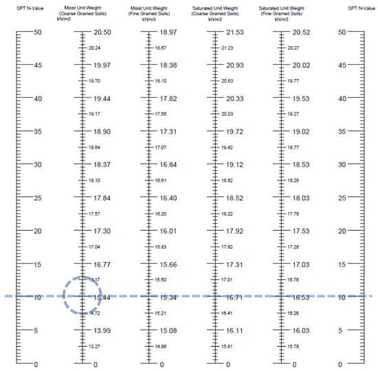 A nomograph can determine the moist and saturated unit weights of coarse-grained and fine-grained soils. Nomographs are especially useful because they can provide these values without on-site computing tools. These essential soil parameters can be determined quickly and easily by simply reading the appropriate values from the nomograph based on the given SPT N-Value. The delineated nomograph is shown in Figure 6.