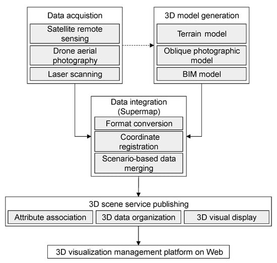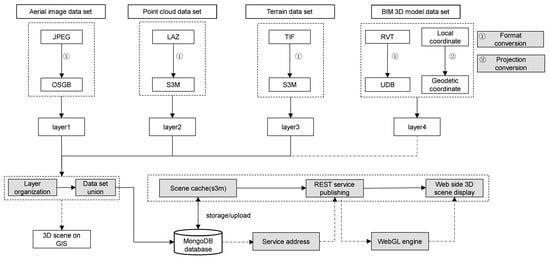 - Currently, compared to the traditional transformation work of geo-data and BIM data [35,37,54], data organization poses a challenge in the process of 3D model integration. In order to address this issue, this study developed a 3D model integration workflow that utilizes GIS software SuperMap to perform format and coordinate conversions. A scene-based hierarchical approach is adapted to overlay various types of 3D data, including point clouds, oblique photography, and BIM models. Subsequently, these datasets are merged into a single dataset, which serves as a data cache for the publishing of 3D scenes, thereby enhancing the efficiency of data integration.