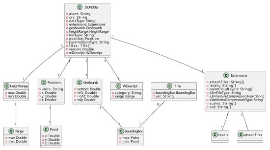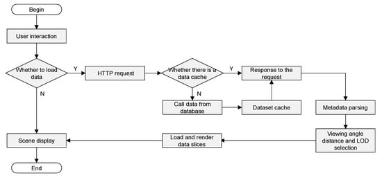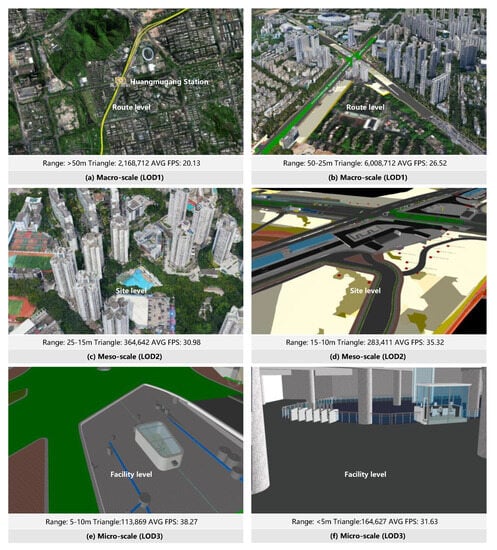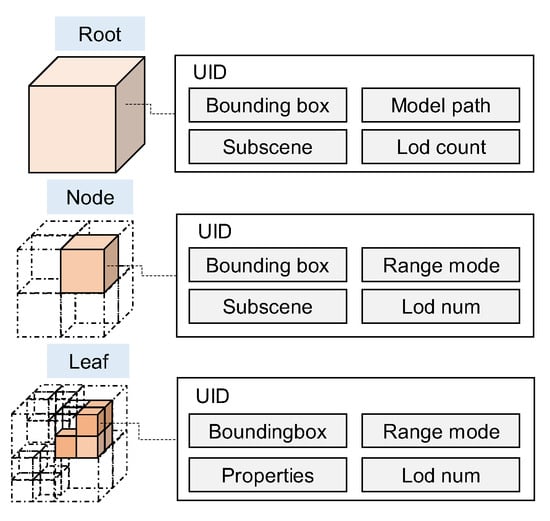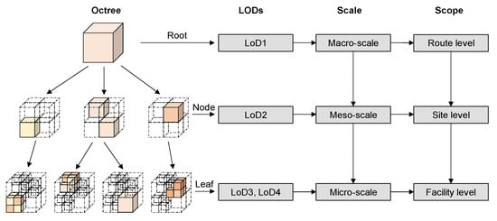 - One of the challenges in web-based 3D scene visualization is effective data loading and model rendering [43,46]. This is primarily due to the increasing volume of data and the complexity and time-consuming nature of handling diverse data sources for large-scale scenes. To address this issue, this paper proposes a 3D visualization strategy that combines octree and Level of Detail (LOD) techniques. The strategy aims to achieve the desired visualization effect for the 3D model, where the scene models are designed with multiple LODs corresponding to different scales. When accessing data at specific scales, only the model that meets the required data precision and display scale is dynamically loaded and rendered, allowing for efficient and optimized visualization.