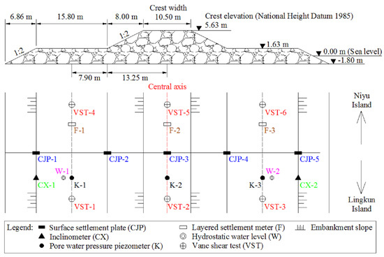 The loading stages for various cross-sections were divided into four to eight levels to reliably consider the difference in the ground surface elevation and the soft soil settlement. For example, in section N5 + 850, the riprap loading process was divided into seven stages, as shown in