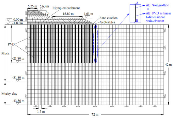 Figure 13, it was found that the drainage effect of the PVD and the riprap loading in the soft soil layers was accelerated, with the consolidation coefficient increasing by 1.4 times. The consolidation coefficient is a key parameter for consolidation calculation. It reflects the consolidation rate of soils. After PVD treatment, the consolidation rate of the soft soil ground was also obviously increased with increase in the consolidation coefficient in comparison to the non-PVD zone. Similar conclusions were also drawn in previous studies using back-analyses of the consolidation coefficient of PVD-improved soft clay from settlement data [