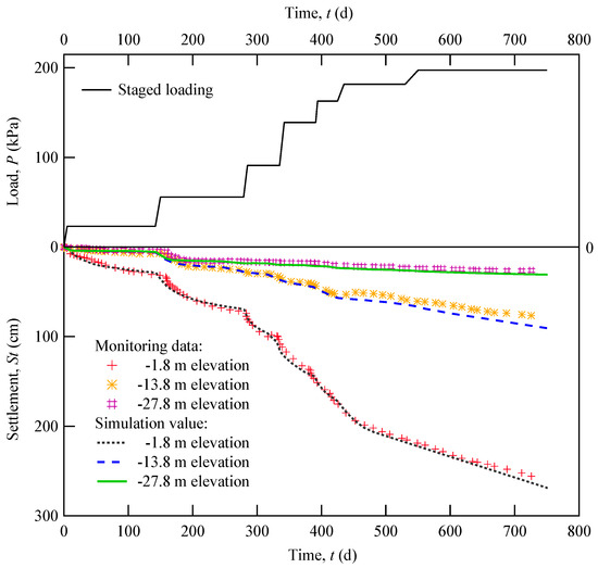 Figure 6 illustrates that the numerical simulation results agreed well with the monitoring data. Consequently, it can be concluded that the deployed model can accurately simulate the vertical settlement of soft soil ground treated by PVD-assisted staged riprap loading. The settlement of the surface and shallow soil layers had a similar stepped pattern following the applied staged loading. However, the gradual settlement pattern faded deeper in the soil profiles. Furthermore, according to the layered settlement monitoring data from three in situ observation sections, by accumulating the layered settlements in the PVD-treated zone (elevation from −1.8 m to −21.8 m) and the non-PVD zone (elevation from −21.8 m to −30.8 m), the vertical settlement in the PVD zone (