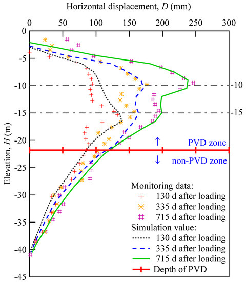 Figure 7. It can be observed that the simulation results were in good agreement with the monitored data. Furthermore, the horizontal displacement mainly occurred in the PVD-treated zone, with a maximum displacement of 246 mm located at around −10 m elevation after 715 days of loading. This −10 m depth was equalt to about half of the used PVD length, while the horizontal displacement decreased sharply for the deeper soil layers and converged to zero at around −40 m elevation.