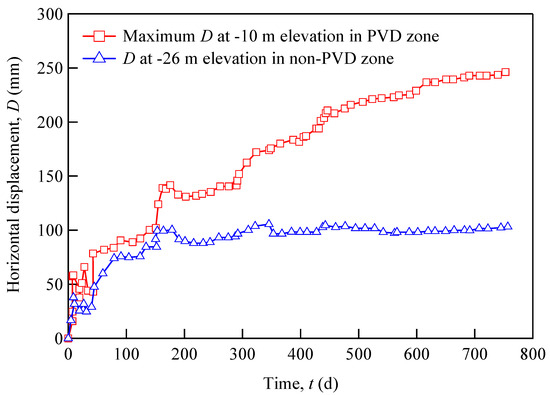 For −10 m (corresponding to the maximum displacement depth), the horizontal displacement increased with time and converged to a constant value after around 600 days. While for −26 m (representing the non-PVD zone), the horizontal displacement converged to a constant value only after 350 days, which mainly corresponded to the initial preloading stage, as shown in