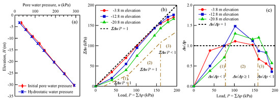 Figure 10a. It can be observed that the initial pore water pressure almost coincided with the hydrostatic water pressure, which verified that the excess pore water pressure of the natural soil ground was almost zero. Then, by accumulating the increment in excess pore water pressure (Δ