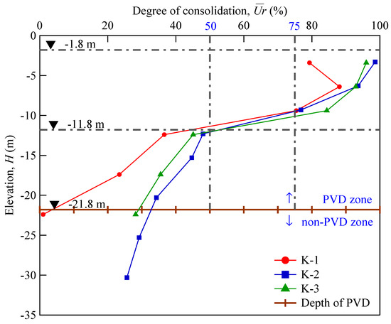 reached up to 75–100%. The results showed that the PVD was efficient for accelerating the consolidation drainage for the soft soil layers; however, the effective depth of the PVD may be different due to the complexity of the prevailing engineering conditions and of the construction process. For example, in section N5 + 850, at the range extending from −11.8 m to −21.8 m elevation,