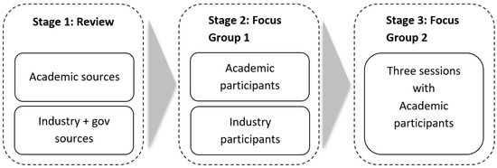 The multiple methods employed in this study encompass an initial content analysis of a focused literature review and industry reports to explore the emerging themes in the construction industry as it undergoes digitalization and industrialization. Secondly, an in-depth analysis of a series of focus group discussions enabled a thorough examination of the key topics. To ensure the credibility of the results, we have conducted member-checking, inter-coder agreement, and a rich description of the topics. The following sub-sections will describe the data collection process in detail in stages (Figure 1), as well as a systematic analysis of the results, to highlight the main findings and outcomes of this study.