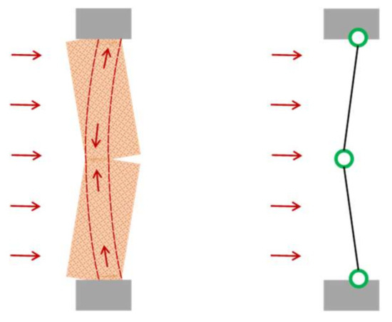 Experimental results [73,74,75,76,77] have shown that the main mechanism of resistance is the arching action that the infill walls can develop beyond the cracking deflection of the panel, and it was recommended to use a novel approach for the development of models [59]. As the initial cracks spread and widen, the panel sustains more significant damage. Two masonry blocks may turn as rigid bodies around their supported ends, which results in a gradual reduction of stiffness under rising OoP loads and the onset of three hinges and a resisting arch [4].