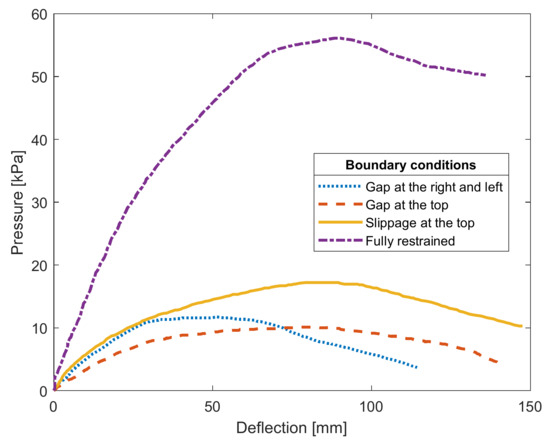 As previously stated, the boundary conditions of infills are critical when it comes to the arching effect, as claimed by Shing et al. (2016) [82], who emphasised that a well-restrained infill on all sides is a requirement for a two-way generation of arching action. The findings of the experimental studies of Dawe and Seah (1989) [75] revealed that the boundary conditions have a considerable impact, demonstrating that the ultimate load capacity of panels with fully restrained infills was times that of panels with gaps or where interfaces slipped (see Figure 4).