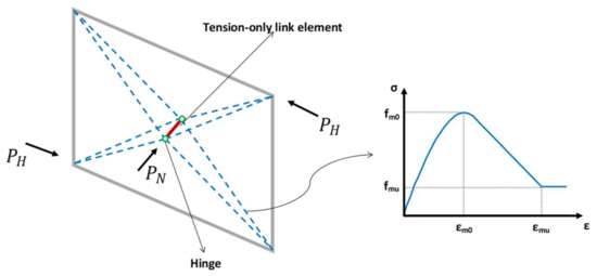 A tension-only elastic link element is shown in Figure 5 as a continuous line in the middle of the infill, whereas the dashed lines indicate nonlinear compression-only members. In order to reduce the capacity of the infill because of cyclic loading or prior damage, the material model for the link may be modified to tolerate permanent deformation caused by severe IP or OoP forces. This may be accomplished by loading and unloading the connecting element to the farthest point previously achieved on the plastic plateau while employing a rigid-plastic tension-only material. To distinguish between the infill’s before and after cracking behaviour, the hinges can be replaced with rotational springs with a specified moment capacity threshold corresponding to the beginning of cracking.