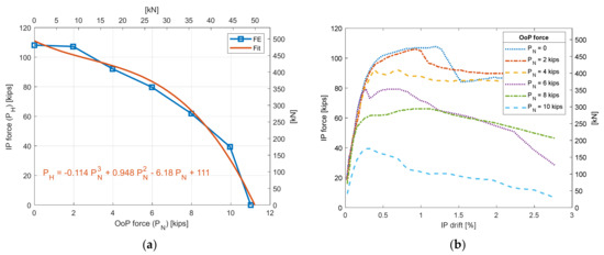 Results of the FE model of infilled RC frame by Hashemi and Mosalam (2007): (a) IP–OoP interaction diagram; (b) IP pushover curves with varying OoP forces. Adapted from [60].