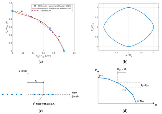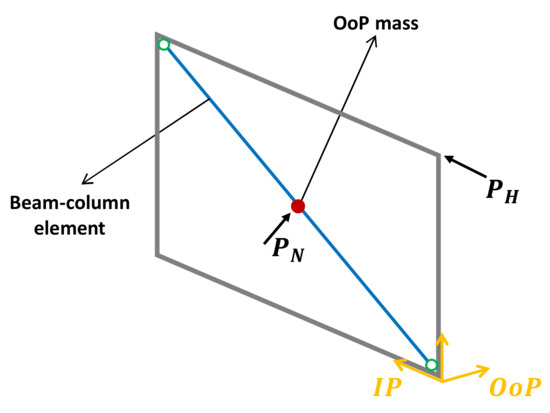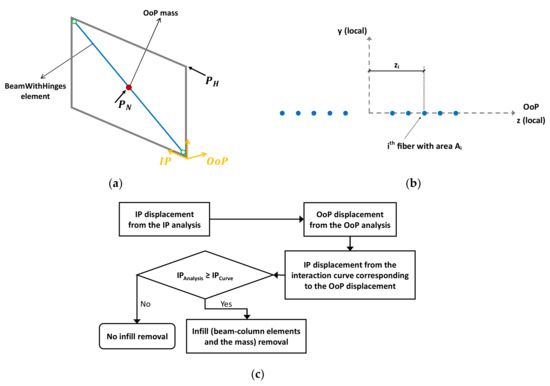 Considering the issues with the SAT infill model, another model was proposed by Kadysiewski and Mosalam (2008) [49] that uses fibre discretisation (Figure 7). This model clearly addresses the interaction between the IP and OoP through the cross section’s discretisation, making it simpler than the previous one in terms of the number of elements.