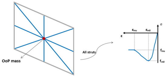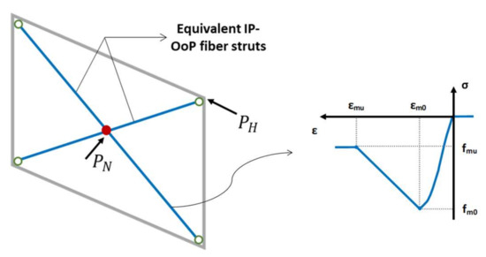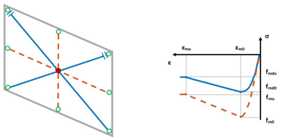 The first model that took into account the IP and OoP resistance of infills against coupled IP and OoP loads was provided by Hashemi and Mosalam (2007) [60]. A 3D strut-and-tie (SAT) system is used in this methodology to simulate the infill, as shown in Figure 5. The model features a double-diagonal strut, consisting of four pin-connected elements (eight resistant beams in total) with a specific compression-only stress-strain law. The diagonal struts are joined by a tie that is shared by both.