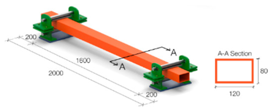 For the purpose of conducting the designed experiment to evaluate the effect of impact load on the weak axis of a rectangular hollow steel profile, a steel profile with sectional dimensions of 120 × 80 × 3 mm with a length of 2000 mm and S275 JR steel class was selected. The beams were placed on their weak axis in the prepared 8 samples. The samples were divided into A and B series in order to avoid any confusion and simplify the work process. Series A samples were the ones that would experience an impact ranging from a drop height of 250 mm to 1000 mm, and series B samples were the ones experiencing an impact from a drop height of 1250 mm to 2000 mm, as presented in Table 2. All test samples were constructed with the same geometry and mechanical properties, as well as the same structural supports. Furthermore, Table 2 provides details about the properties of test specimens.