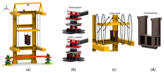 (a) Test setup, (b) beam supports, (c) sliding rods, (d) circular head hammer.