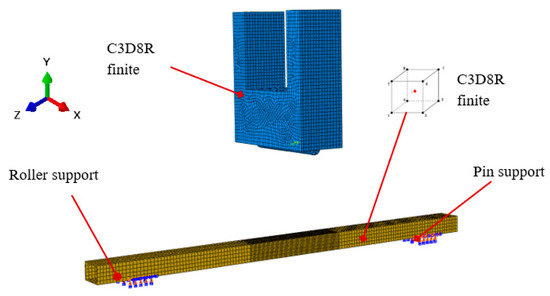 We developed 8 FE models, namely S#1Fem, S#2Fem, S#3Fem, S#4Fem, S#5Fem, S#6Fem, S#7Fem, and S#8Fem, resembling the samples in the experiment. After developing the models, we calculated the stress distributions, plastic deformations, reaction forces, displacements, and accelerations of each model. To achieve accurate results, we modeled all parts of steel profiles, and the impactors were modeled. We used the ABAQUS/Explicit [39] package to carry out 3D nonlinear finite element analysis. We used the eight-node brick element with reduced integration (C3D8R) element type in the modeling process. We modeled the impactors as having a discrete rigid body, and the element was modeled as C3D8R (Figure 4).