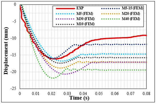 Figure 7 illustrates the displacement-time graphs for all the finite element cases as well as the experimental results in which the closest graph to the experimental results was from the mesh size M5-15. Details of the mesh convergence analysis are presented in Table 3. As the results obtained from M40 were compared with those from M5-15, the results obtained by the latter were 31 times more realistic than M40.