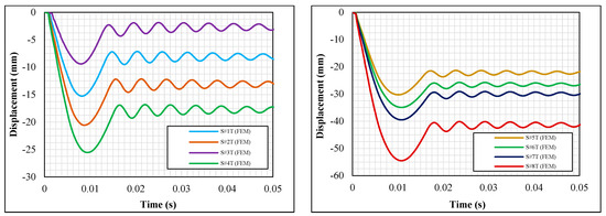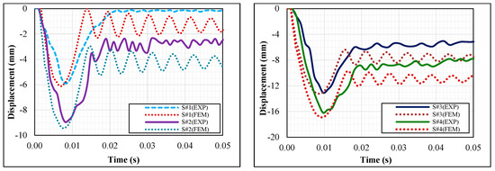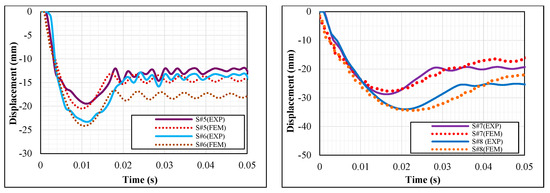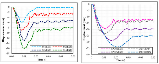 In the experimental study, the displacement-time curves of eight test specimens placed along the weak axes with the same support condition and hammer weight but different drop heights are shown in Figure 8, and the data obtained from these experiments are presented in Table 4.
