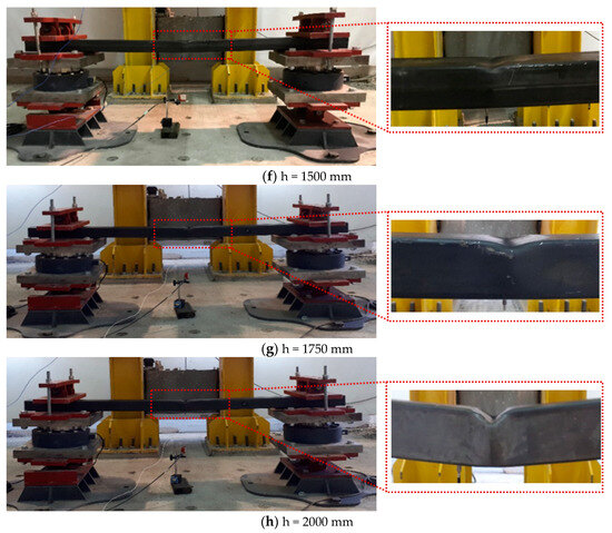 The deformation by 1471.50 J energy caused the maximum displacement (33.9 mm) in series B (S#8EXP). The hammer drop-height difference and amount of energy between S#1EXP and S#8EXP have increased 8 times, while the midpoint maximum displacement values have increased approximately by 6 times. As per the available studies in the literature, the plastic deformation occurrence depends on the speed of the impact force and the boundary conditions [1,22]. The results obtained from the experimental study were in line with the literature, and the increase in the plastic deformation of the test elements was directly proportional to the hammer drop height and amount of impact energy. In addition, the distances of the denting that occurred in the sample were examined as well.