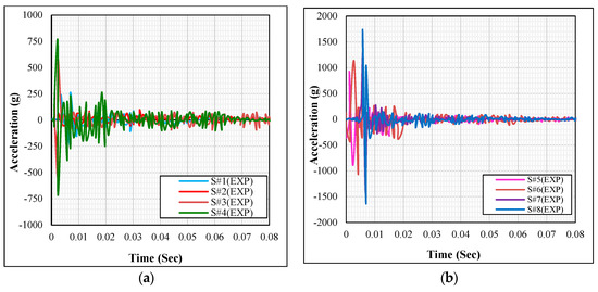 In order to determine the behaviors of all the test specimens with different drop heights right after the impact force application, accelerometers were placed under the point where the impact force was applied to measure the acceleration values with respect to time and interpret the obtained results mathematically. Since the accelerometers are very sensitive, the obtained data would be affected by the external noise, and the noise can be seen as vibration on the acceleration-time curves. As Saatci [14] concluded that the deformations in the elements develop in accordance with the acceleration values, the acceleration values obtained from the experimental study are important in determining the element behaviors. The acceleration values of the test samples S#1EXP, S#2EXP, S#3EXP, and S#4EXP placed along the weak axis in series A were measured as 260 g, 290 g, 570 g, and 743 g, respectively. The acceleration values of the test samples S#5EXP, S#6EXP, S#7EXP, and S#8EXP placed along the weak axis in series B were measured as 910 g, 1092 g, 1306 g, and 1706 g, respectively.
