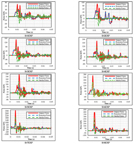 As per the experiment, the reaction force values obtained from the load cells in pin and roller supports increased as the drop height increased. Therefore, the biggest support reaction was obtained in S#8EXP, and the smallest support reaction was seen in S#1EXP along the weak axis of the steel beam. The inertia force value was obtained from the accelerometer placed in the middle of the test sample. Therefore, when the hammer drop height increased on the test sample, the acceleration value increased, increasing the inertia force in the element. Therefore, the highest and lowest inertia forces were observed in S#8EXP and S#1EXP, respectively. Maximum impact, inertia, and total reaction force values were obtained as a result of the experiments and are given in Table 5. According to the D’Alembert dynamic equation principle, the sum of the beam inertia force and support reactions constitutes the impact force. The greatest impact force was generated in S#8EXP (388.18 kN), and the lowest impact force was generated in S#1EXP (71.80 kN).