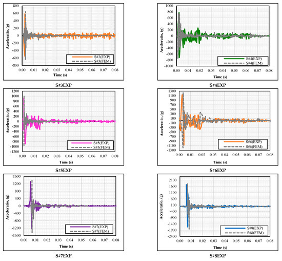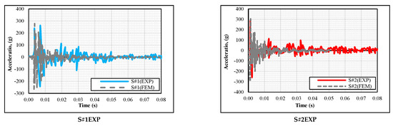 In our study, there was a good fit between the experimental results and finite element models (FEM). Figure 12 illustrates comparative acceleration data of both experimental and FEM results. The values obtained from the experiments and FEM have increased as the hammer drop height and amount of energy were increased. Since the impact force is a spontaneous loading, the maximum value was obtained at a single point in the acceleration-time curves, and the acceleration values gradually decreased due to damping formed in the element and were completely damped out after 0.08 s. This behavior was not only observed experimentally but also in the finite element models. As shown in Figure 12, the maximum acceleration value under the midpoint of the beam was 290 g in S#2EXP and 301 g in S#2FEM. The difference between the finite element model and the experimental result was only 3.7%. However, S#3EXP achieved an acceleration value of 570 g, and S#3FEM achieved 640 g, having the largest difference (12.28%) between the finite element model and the experiment.
