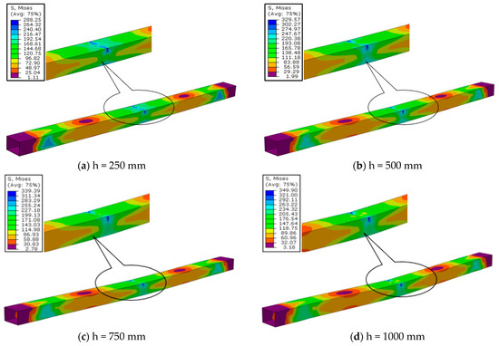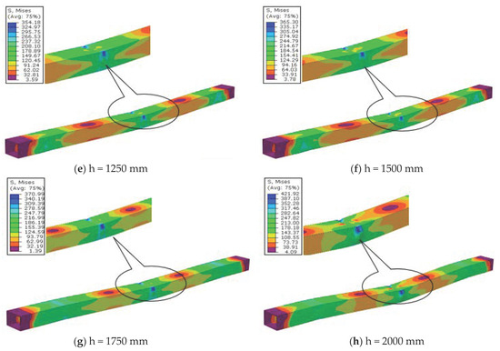 As the deformation distributions in the finite element models were examined, they were exactly compatible with the deformations obtained in the experimental study. Since the impact test is spontaneous loading, some element behaviors that were not noticed during the experiment could be seen more clearly in finite element modeling. In addition, as the amount of energy increased in the finite element models, the heat map color changed in the stress distributions, and the stress moved toward the bottom parts of the beams, as shown in Figure 15.