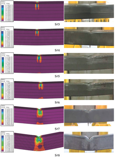Finite element equivalent plastic strain (PEEQ) and experimental damages are given and compared with the strain values in Figure 16. As can be seen, the predicted and observed findings are similar, where an increase in drop height and amount of energy caused larger stresses in the elements and, consequently, larger displacements. Among all the samples, the highest energy and displacement occurred in the S#8 test element, and this produced the highest stress value in the finite element analysis. The lowest energy and displacement value occurred in the S#1 test element, which produced the lowest stress in the finite element analysis. The strain obtained from the finite element analysis was measured at the same point in all samples, and the lowest strain was calculated as 5.31 × 10−2 in S#1FEM, while the highest strain was calculated as 2.56 × 10−1 in S#8FEM. As a result of increasing the hammer drop height and amount of energy by 8 times, the strain increased by 482%.