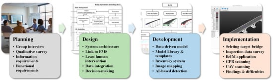 Figure 1). To better understand the practical requirements during the planning, interviews were conducted among three key groups: bridge owners, managers, and outsourced inspection companies. The information and functional requirements obtained from these interviews were used to design the system architecture of a BrIM-based BMS, which facilitates data exchange with the existing facility management system (FMS). During the development, a data-driven modeling approach that imports fundamental data from the FMS was adopted for efficient 3D modeling. This approach enables model generation using a model library and templates with minimal human intervention. A mapping method was implemented to visualize the inspection data within the 3D models. To ensure effective data management, an inventory code system was incorporated, enabling the organized storage and retrieval of not only the maintenance history but also new inspection data. This code system also facilitated the automatic quantification of defect data and bridge assessments. With these features, the developed BrIM-based BMS can support decision-making by providing data aggregation, dashboards, and reporting functionalities. A case study shows the implementation of the system, and its feasibility, limitations, and scalability for additional features are discussed.
