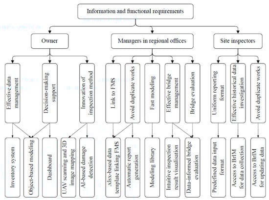 After the inspection tasks are completed by the third-party companies, reports are submitted and reviewed by managers in regional offices and uploaded to the FMS. Important information, such as assessed grades, damage amounts, and expected repair costs, is directly entered, whereas most of the extensive content is uploaded in the document file format. Based on the uploaded information, the KEC determines the direction and budget for future maintenance. This approach faces limitations as the number of aging bridges rapidly increases. Consequently, the prioritization of actions became challenging, and maintenance costs significantly increased. Action through a rational evaluation was required before rapid deterioration occurred, but the time required to analyze information for evaluation increased, and the reliability did not meet expectations. Therefore, the requirement for renovating the maintenance system to efficiently store, manage, and utilize information emerged, and the KEC aimed to solve this through BrIM. To implement BrIM, we interviewed bridge maintenance stakeholders to understand the information and functional requirements, as shown in
