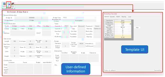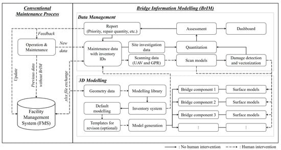 Section 2, owing to the loss or incomplete digitization of data for existing bridges in the FMS, the utilization of fundamental data was considered to ensure stable data collection. To minimize human intervention during the modeling process, a modeling library, templates, and inventory system were considered, and the concepts of a surface model and mapping were applied to store damage information. Damage information obtained through visual inspections, UAVs, and GPR (ground penetration radar) scanning was stored in each object according to the inventory system. Although human intervention is required during the data input process, the quantification and evaluation procedures are performed automatically within the system. Additionally, dashboards and reporting functionalities were considered to enhance usability, enabling users to determine the direction of future maintenance based on the provided information. Detailed explanations are presented in the following subsections.
