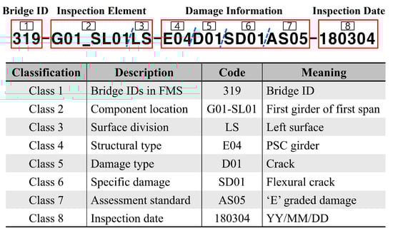 Figure 4 shows the coding system for PSC bridges as an example. The codes used in BrIM comprise four main categories: “Bridge IDs,” “Inspection Elements,” “Damage Information,” and “Inspection Date.” Bridge IDs have already been defined in FMSs and BrIM refers to them for consistency. Inspection Elements indicate the location of the inspected bridge components, and the surfaces are divided into left, right, top, and bottom to facilitate image mapping. The Damage Information code follows the damage assessment standard outlined in the National Maintenance Guidelines of South Korea [